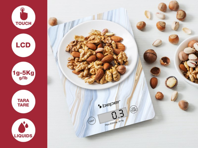 Bilancia da cucina digitale salvaspazio con piatto in vetro temperato dalle innovative fantasie e funzione tara che permette di pesare più alimenti in successione