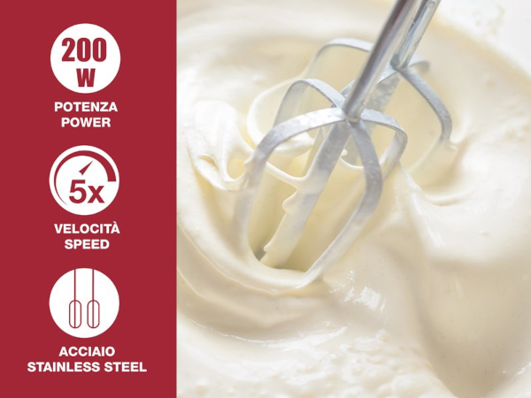 Lo sbattitore ha 5 velocitā selezionabili e in dotazione una coppia di fruste in acciaio inossidabile per montare e mescolare