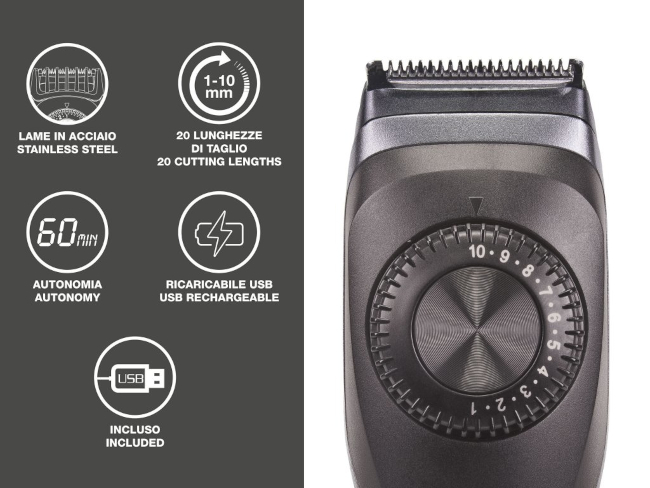 Le lame removibili facilitano la pulizia, mentre gli accessori inclusi – cavo USB-C, olio lubrificante e spazzolina – completano un kit pratico e completo per l’uso quotidiano