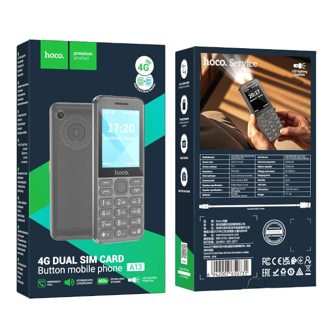 HOCO A13 è un cellulare semplice e funzionale con supporto al 4G e al dual SIM, creato per le persone che apprezzano la comodità, la lunga durata della batteria e le funzioni di comunicazione di base