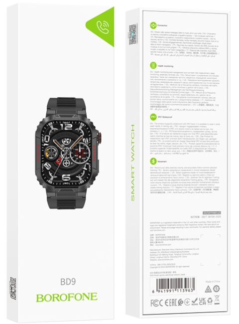 Lo Smartwatch Borofone BD9 è uno smartwatch moderno dotato di uno schermo da 2,01" con risoluzione 240x296p e grado di impermeabilità IP67, che ne consente l'uso sicuro in condizioni quotidiane