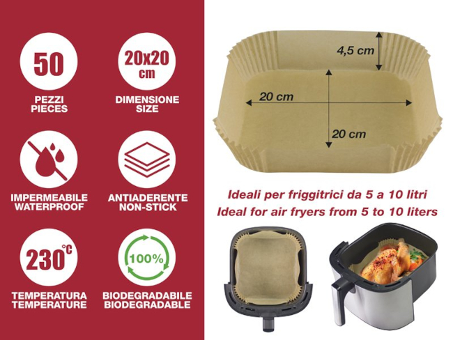 SET 50 PEZZI DI CARTA FORNO PER FRIGGITRICI AD ARIA - QUADRATI E NON FORATI