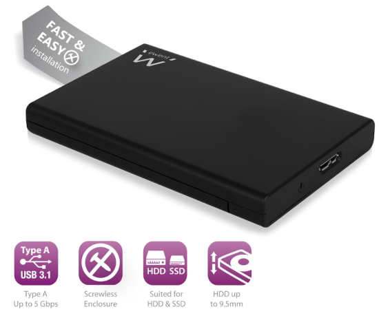 L'installazione di un disco rigido o SSD è estremamente semplice facile grazie al design di montaggio senza viti dell'EW7044. Bastano 3 passi per portare con sé i file preferiti. In primo luogo, aprire il box. Quindi, collegare il disco rigido al connettore SATA e infine chiudere il box. L'EW7044 è pronto per il collegamento immediato al notebook o al computer! Il cavo di collegamento USB in dotazione fornisce l'alimentazione necessaria per il disco rigido tramite il notebook o il computer.