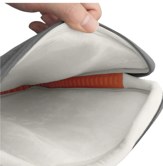 Un comodo manico arancione assicura un trasporto confortevole, mentre una targhetta con logo personalizzato che richiama il prodotto aggiunge eleganza e distingue la borsa dagli altri accessori. Perfetta per trasportare laptop e tablet fino a 14", unisce stile e funzionalità