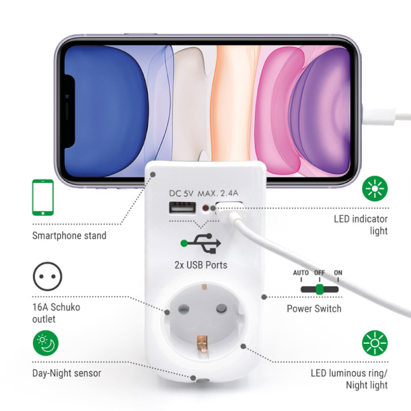 ADATTATORE 1 SCHUKO 16A + 2 USB 2.4A/5V CON SUPPORTO E SENSORE DIURNO/NOTTURNO BIANCO