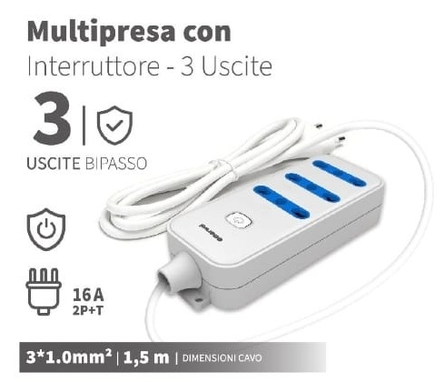 MULTIPRESA CON INTERRUTTORE A 3 USCITE 16A 250V MAX 3680W 1.5M